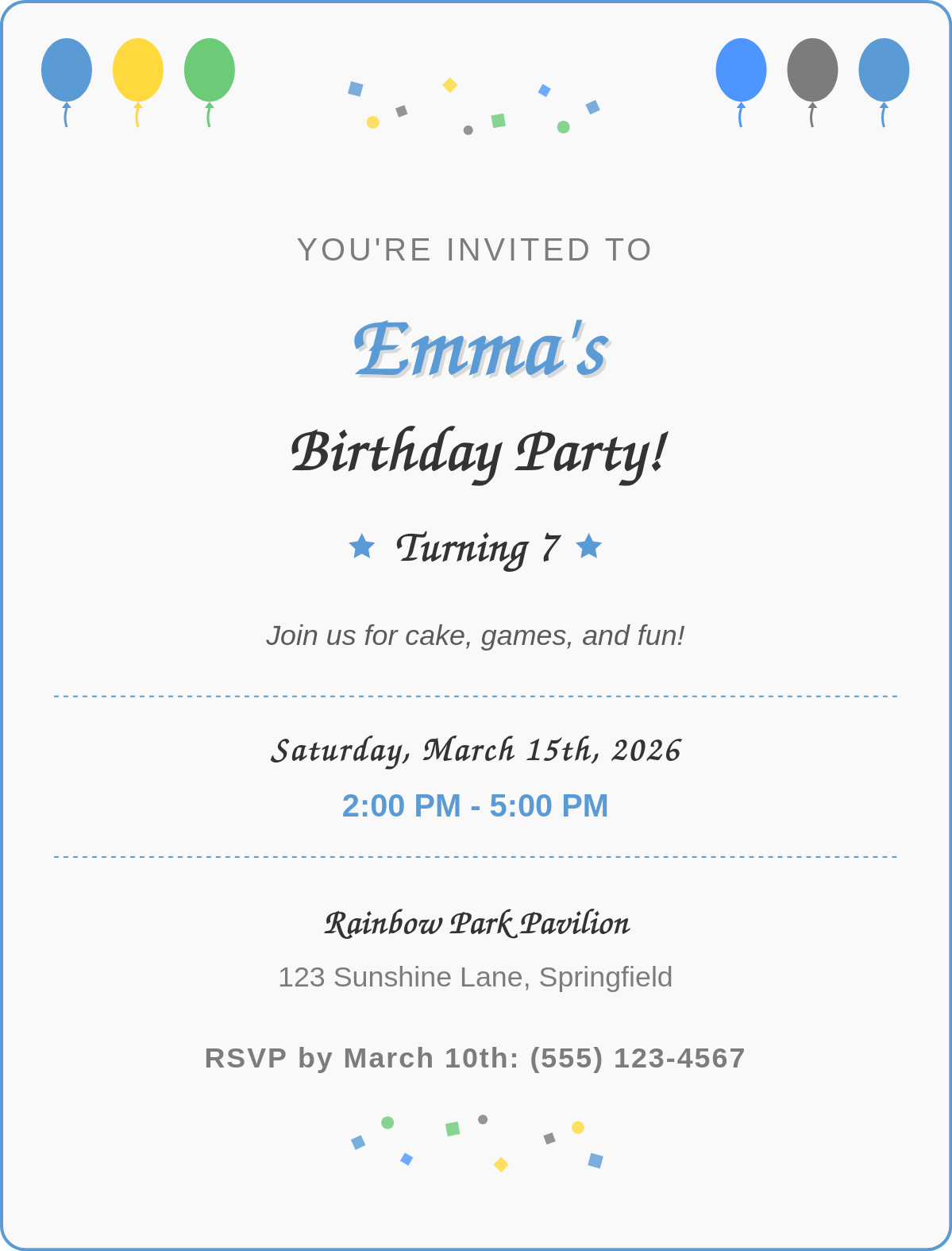 - Children's birthday parties — Create colorful, playful invitations with balloons and confetti for kids' celebrations